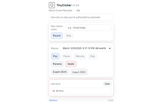 Macro Cursor Recorder, also known as TinyClicker, is a powerful browser extension designed for Chrome that facilitates the recording and replaying of user interactions on authorized websites. This tool captures a wide range of actions including mouse movements, clicks, drags, and keyboard inputs, simulating a natural cursor experience during playback. It is particularly useful for automating repetitive tasks, testing web applications, and enhancing productivity workflows.